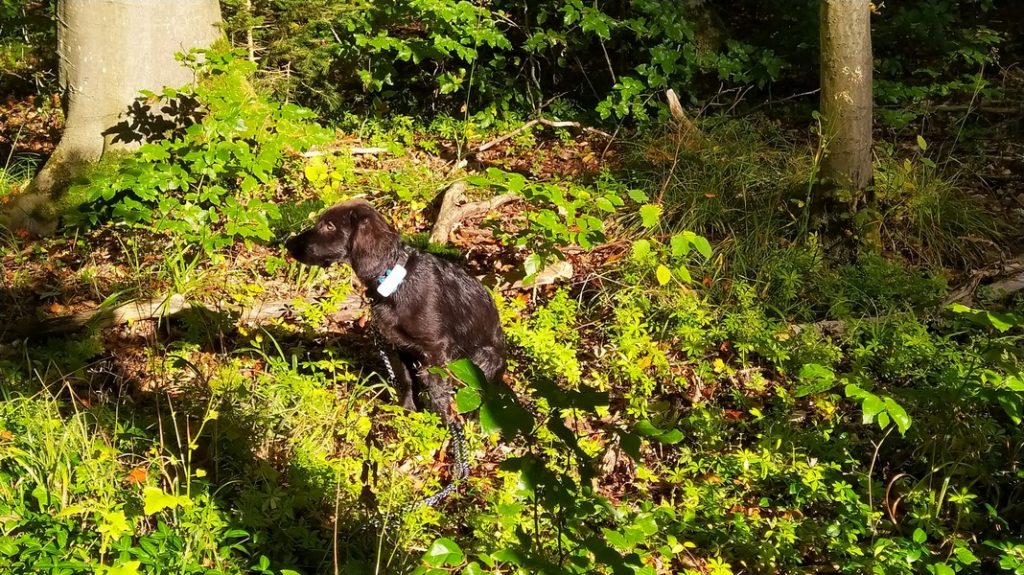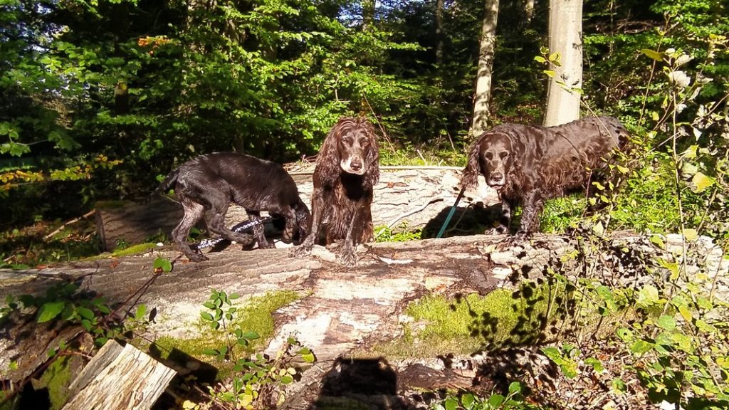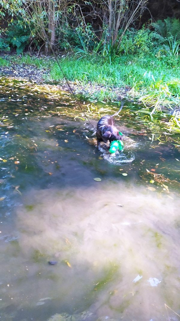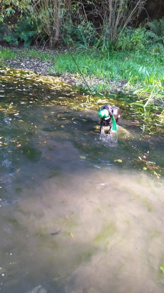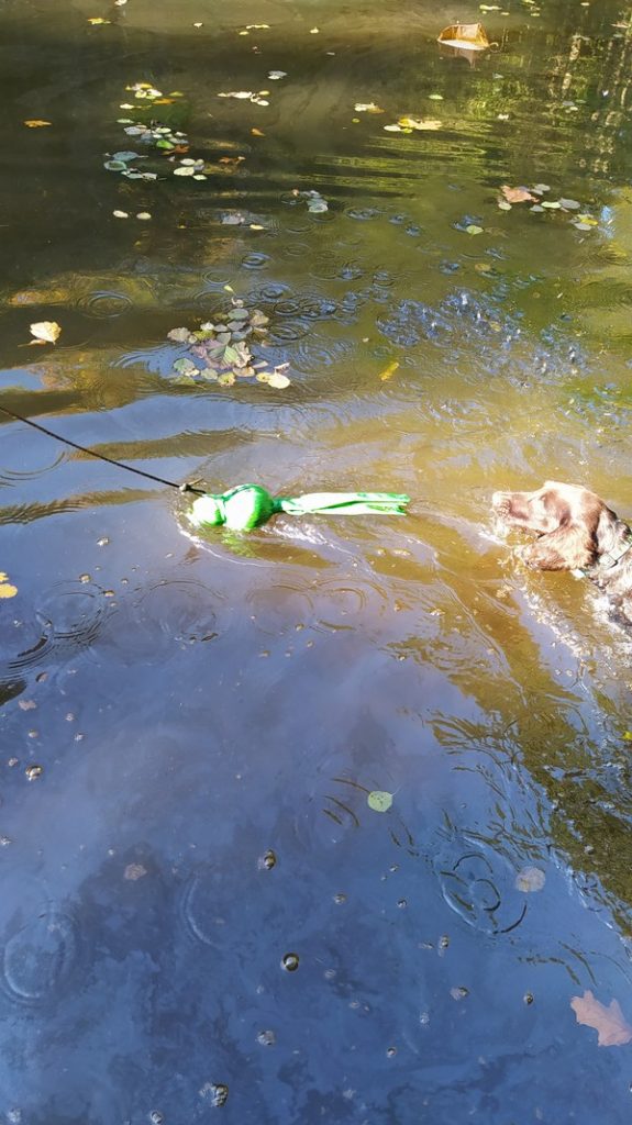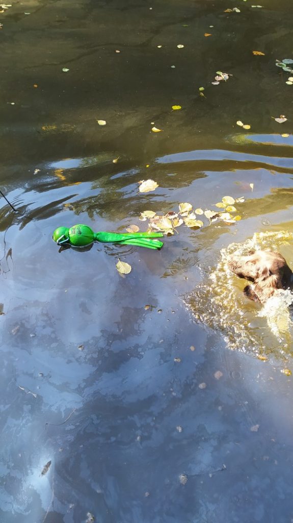 das schöne Herbstwetter wollen wir ausnützen, um an den Teich zu fahren. Nach 2, 3 Versuchen holt Kira den Wubba schon schwimmend aus etwas tieferem Wasser. Zum Schluss schwimmt sie noch eine kleine Runde und rettet ein grosses Blatt bis ans Ufer.