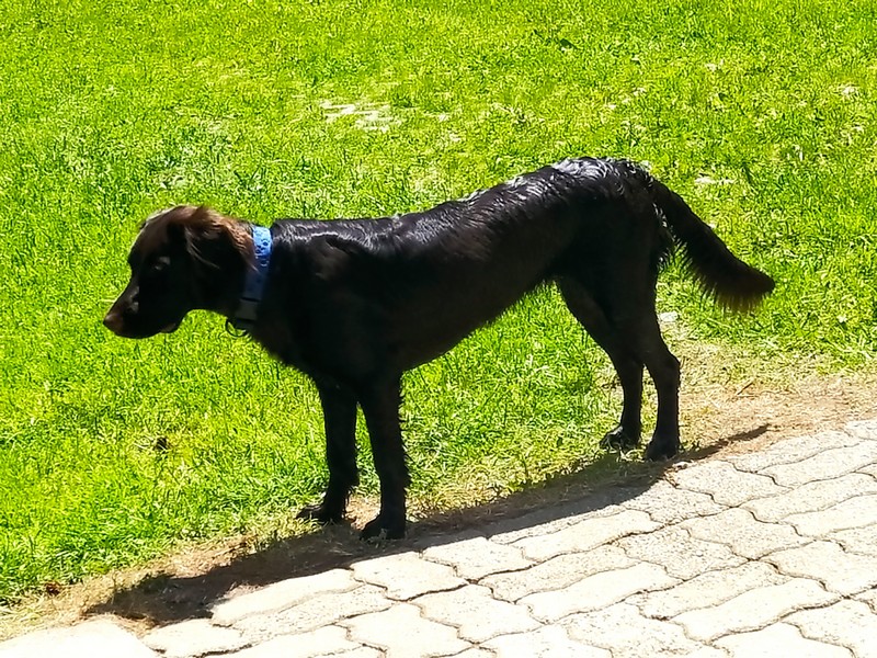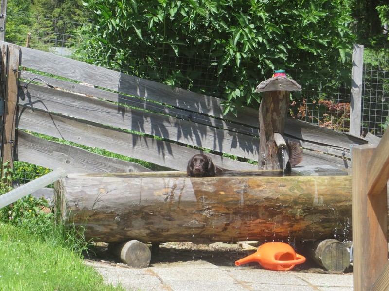 Da unser Teich wegen Wartungsarbeiten noch gesperrt ist, hat Kira entdeckt, dass man auch im Brunnen ein Vollbad nehmen kann.